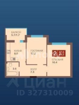 Характеристики квартиры:общая площадь — 47.5 м2жилая комната — 12,2 м2жилая комната — 16,4 м2кухня — 8 м2лоджия — 5,7 м2 (дополнительное пространство для отдыха);санузел с ванной — 3,6 м2
