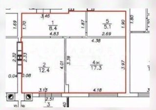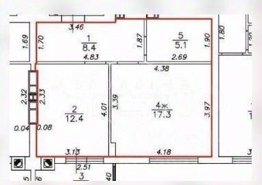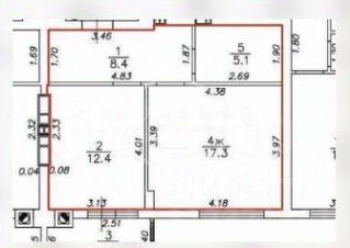 Общая площадь квартиры 43,2 кв .м, включающая в себя просторную комнату площадью 17,3 кв. м и удобную кухню 12,4 кв. м с выходом на застекленную и утеплённую лоджию 2,2 кв. м, большая прихожая 8,4 кв. м.