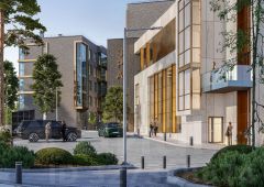 Элегантный дизайн: фасад здания отделан элитными материалами, такими как клинкерная плитка и медные панели, выдерживающие испытание временем.