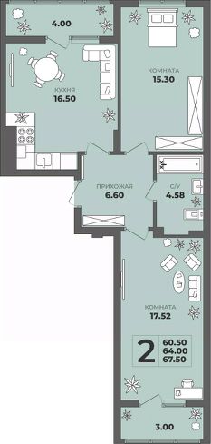 Продаётся 2-комнатная квартира в строящемся доме (Дом 1), срок сдачи: II-кв. 2027, общей площадью 64 кв.м., на 2 этаже. ЖК "ГРИНВУД".