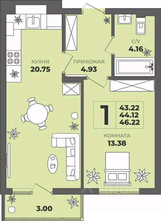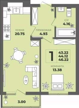 Продаётся 1-комнатная квартира в строящемся доме (Дом 1), срок сдачи: II-кв. 2027, общей площадью 44.12 кв.м., на 2 этаже. ЖК "ГРИНВУД".