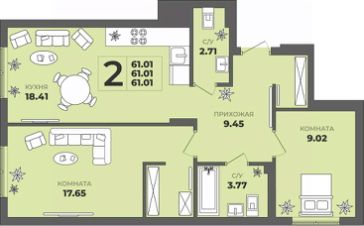 Продаётся 2-комнатная квартира в строящемся доме (Дом 2), срок сдачи: II-кв. 2027, общей площадью 61.01 кв.м., на 1 этаже. ЖК "ГРИНВУД".