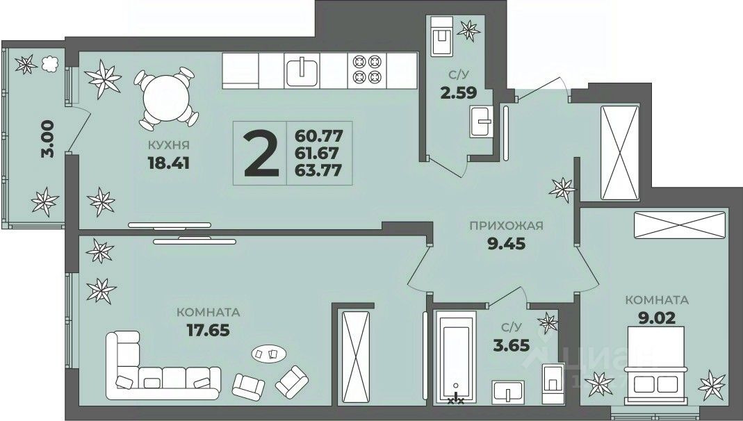 Общая площадь61,67 м²