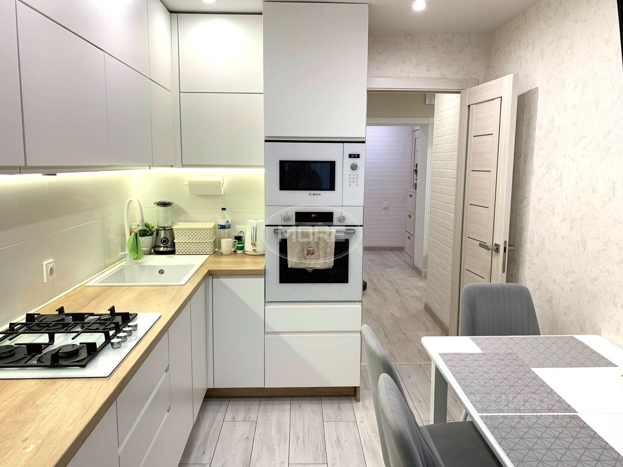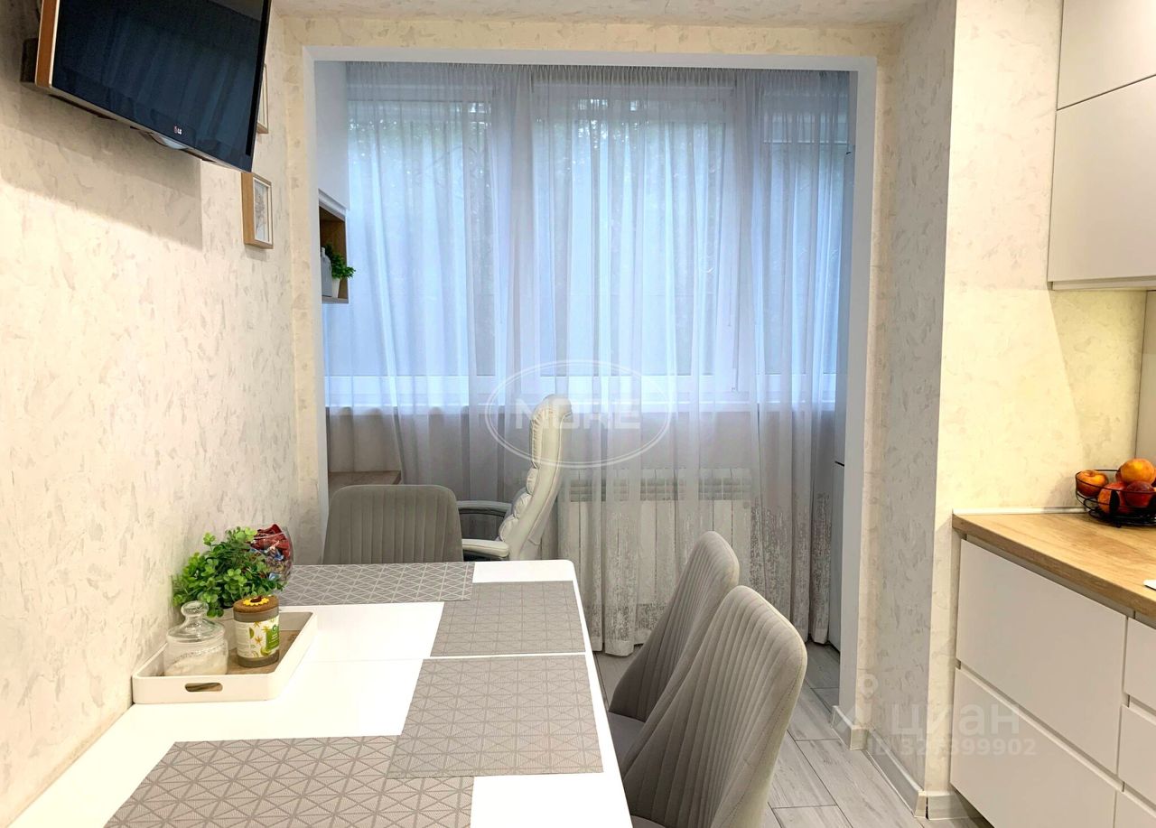 Кухня совмещена с лоджией в современном стиле, есть вторая застекленная лоджия в спальне.