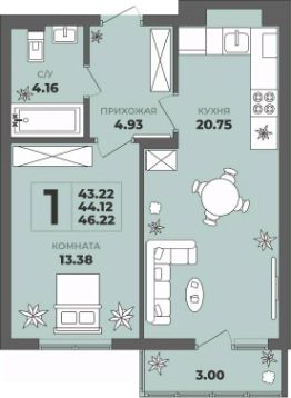 Продаётся 1-комнатная квартира в строящемся доме (Дом 1), срок сдачи: II-кв. 2027, общей площадью 44.12 кв.м., на 1 этаже. ЖК "ГРИНВУД".