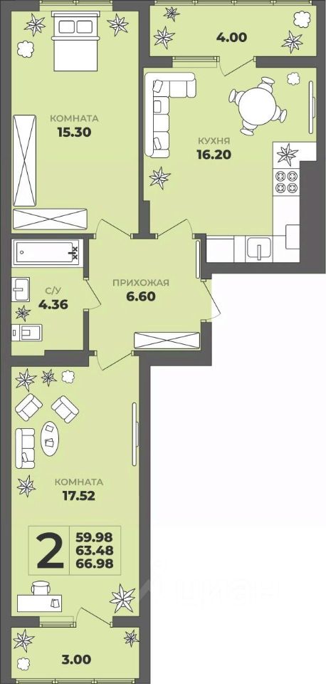 Продаётся 2-комнатная квартира в строящемся доме (Дом 1), срок сдачи: II-кв. 2027, общей площадью 63.48 кв.м., на 6 этаже. ЖК "ГРИНВУД".
