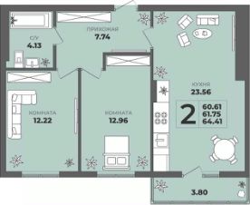 Продаётся 2-комнатная квартира в строящемся доме (Дом 2), срок сдачи: II-кв. 2027, общей площадью 61.75 кв.м., на 2 этаже. ЖК "ГРИНВУД".