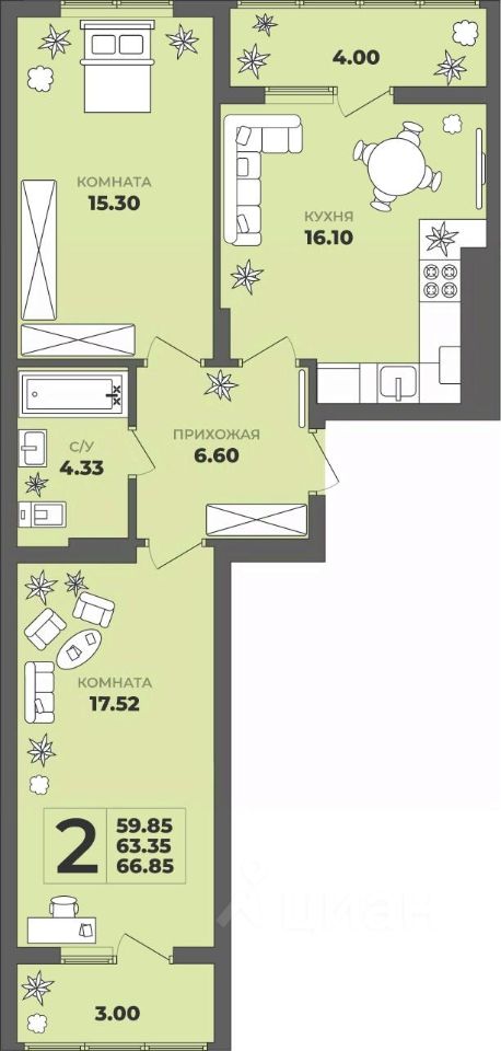 Продаётся 2-комнатная квартира в строящемся доме (Дом 1), срок сдачи: II-кв. 2027, общей площадью 63.35 кв.м., на 8 этаже. ЖК "ГРИНВУД". - Жилой комплекс из двух 8-ми этажных дoмoв - Комфортные и продуманные планировки - Kласc энepгоэффeктивнocти B (выcoкий) - Качественные серый ключ - Автономное газовое отопление. - Лоджии и балконы остеклены (алюминиевые ограждающие конструкции) - Бесшумные грузопассажирские лифты - Качественные и безопасные входные двери - Современное благоустройство двора с детскими и спортивными площадками, местами отдыха взрослых и детей - Ипотека в ВТБ, Банк Санкт-Петербург, Альфа-Банк, Банк Дом РФ ЖК "Гринвуд" находится в экологически чистой части бывшего Балтийского района. Сейчас к этой территории повышенный интерес: здесь нет крупных производств, много зелёных уголков, развитая социальная инфраструктура. Улучшается и транспортная доступность района. В шаговой доступности от ЖК расположена обширная зелёная зоной у озера Пеньковое. Тихое уютное место подарит отдых от городской суеты. При этом рядом находится вся необходимая инфраструктура: детские сады, школы, супермаркеты, рынок, фитнес-центры, салоны красоты, библиотека, торговые центры и остановки общественного транспорта. ЖК "Гринвуд" выполнен в современном архитектурном стиле. На комфортной прилегающей территории предусмотрены места для отдыха взрослых, детские и спортивные площадки, вместительная парковка. В доме также располагаются нежилые помещения различного назначения, так что можно рассчитывать на салоны красоты, аптеки, медицинские центры и магазинчики прямо в ЖК. РЯДОМ: - Озеро "Пеньковое"- Остановка общественного транспорта в 5 минуте ходьбы - Южный рынок - Детский сад 136 - Детская поликлиника 4 - Школа 6 и 56 (2 корпус) - Спортивная школа - Супермаркеты: "Пятерочка", "Вестер" и пр. - Аптеки и медицинские учреждения - АЗС Лукойл