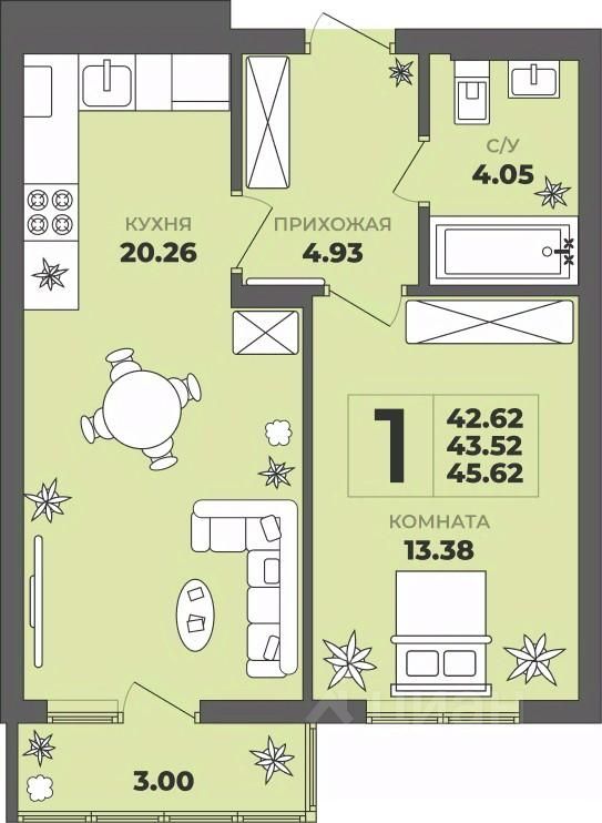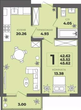 Продаётся 1-комнатная квартира в строящемся доме (Дом 1), срок сдачи: II-кв. 2027, общей площадью 43.52 кв.м., на 2 этаже. ЖК "ГРИНВУД".