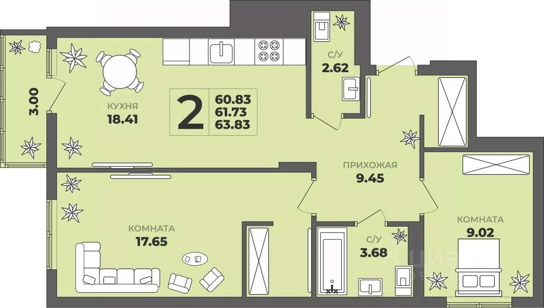 Продаётся 2-комнатная квартира в строящемся доме (Дом 2), срок сдачи: II-кв. 2027, общей площадью 61.73 кв.м., на 2 этаже. ЖК "ГРИНВУД".