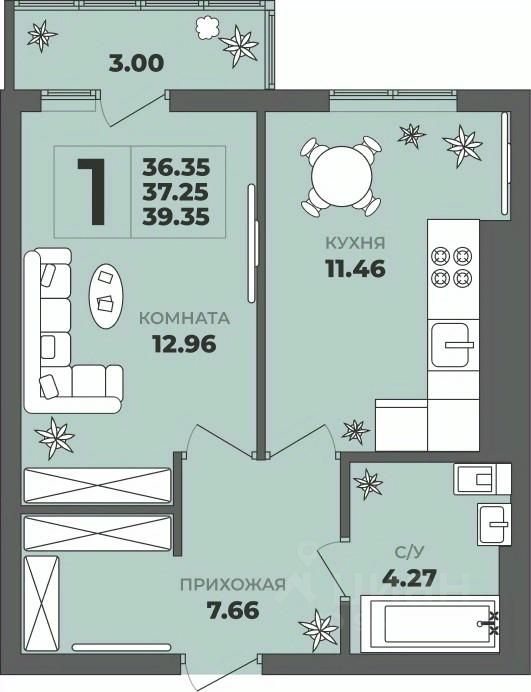 Общая площадь37,25 м²