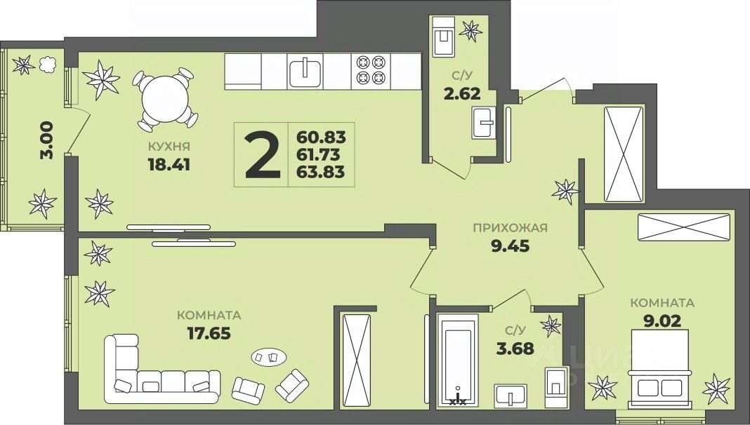 Общая площадь61,73 м²