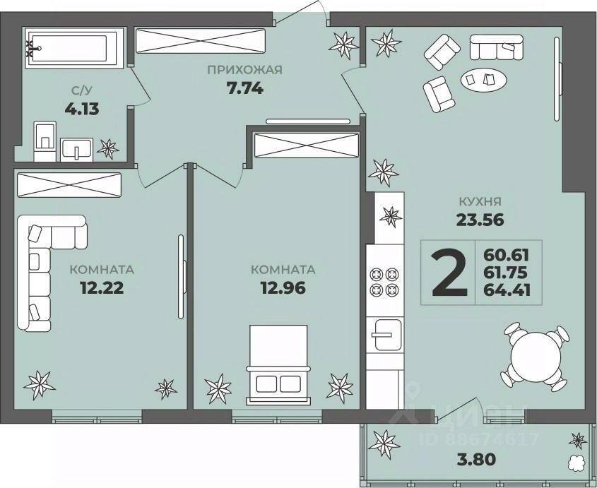 Продаётся 2-комнатная квартира в строящемся доме (Дом 2), срок сдачи: II-кв. 2027, общей площадью 61.75 кв.м., на 3 этаже. ЖК "ГРИНВУД".