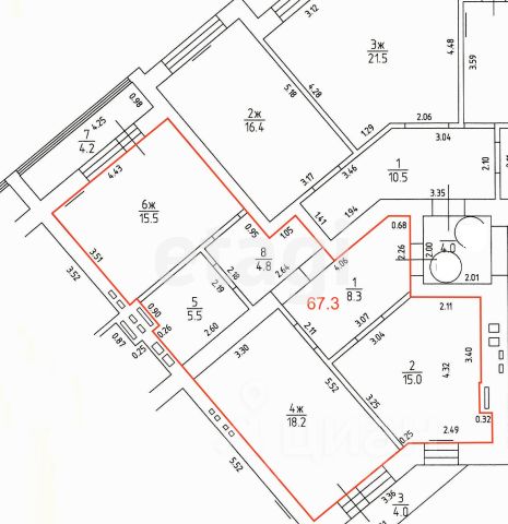 комнаты 18.2 м2, и 15.5 м2, просторную кухню 15 м2, совмещённый санузел 5.5 м2, две застеклённые лоджии 4 и 4.2 м2