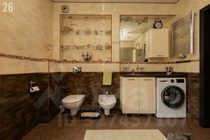 Санузел просторный: совмещён с ванной, душевой кабиной, биде, авторской инсталляцией и водяным подогревом пола.