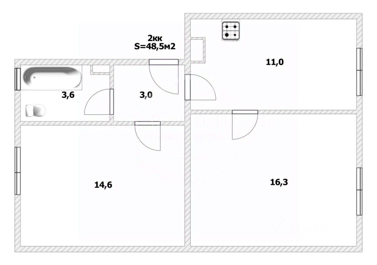 Общая площадь квартиры 48,5, кв.м, включающая в себя светлую кухню 11 кв.м, большой зал 16,3 кв.м. и спальню 14,6 кв.м. с видом на тихий двор, совмещенный санузел 3,6 кв. м. и коридор 3 кв.м. В квартире установлены счётчики. Кухонная мебель и техника остаются.