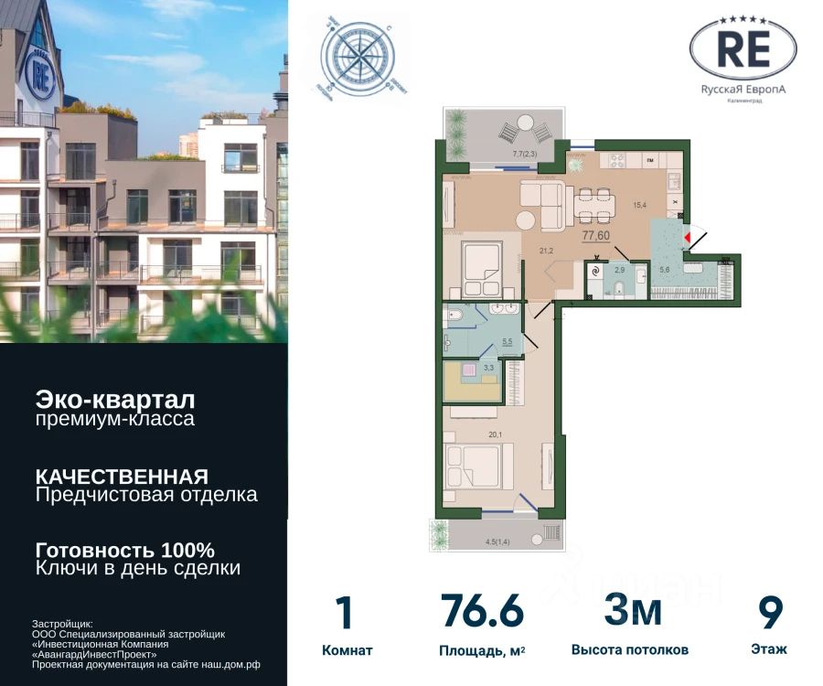 Продаётся 1-комнатная квартира в сданном доме (Адрес Счастья (Дом 4)), срок сдачи: III-кв. 2023, общей площадью 76.6 кв.м., на 9 этаже. Эпохальным событием в градостроении станет строительство первого в России Нарру Сіtу — Счастливого Города под названием "RусскаЯ ЕвропА". Новый экоквартал комфорт-класса на площади более 20 гектаров. Новый уровень комфортамногоэтажной застройки. От создателей Цветного Бульвара жилого комплекса, удостоенного множества наград, в том числе Федеральной премии URBAN AWARDS 2018 "Лучший региональный жилой комплекс комфорт-класса".Каждая квартира — индивидуальный проект, выполненный по европейским стандартам эргономики жилья. Энергосберегающее панорамное остекление открывает живописные виды и создает солнечное настроение, окна во всю стену от потолка до пола наполняют помещения светом. Тройной стеклопакет в алюминиевом профиле обеспечивает звуко- и теплоизоляцию. Высота потолков от 3-метров, рациональное размещение дверей, окон и вентканалов обеспечивают правильную циркуляцию воздуха в помещениях, способствуя созданию здорового микроклимата и экономию средств на отоплении и кондиционировании.Просторные балконы-террасы шириной от 2м — комфортабельное пространство, по сути, летняя гостиная + столовая + лаунж-зона — место отдыха для всей семьи и уединенного релакса. Домашняя сауна в ванной комнате — свежее решение и практичный вариант для истинных любителей банного отдыха и оздоровительных процедур в любое удобное время у себя дома."Условно грязная зона" прихожей отделена от чистой, за "пограничной чертой" — домофон и гостевой туалет, также выполняющий функции прачечной с местом для хранения бытовой химии, которую небезопасно держать в ванной. Третий кран с питьевой водой на кухне. Автономное отопление регулируется компактным теплопунктом в квартире, все громоздкое оборудование вынесено в отдельную придомовую газовую котельную, газа в квартирах нет.В первом жилом комплексе "Ласточкино гнездо" проекта "RусскаЯ ЕвропА" объединена архитектурная стилистика городов России и соседствующих европейских. Создана совершенно новая среда, где здания и природный ландшафт становятся единым целым. Это положительно сказывается не только на архитектурном облике всего комплекса, но и позволит в будущем каждому жителю почувствовать тесную связь и единение с природой.Комплекс "Династия". Чистота и гармония ритма архитектурного ансамбля, экологичность застройки в приоритете:- Закрытый трафик автомобилей с полной изоляцией зоны автостоянок транспорта от жилой зоны микрорайона;- Использование дождевой воды на технологические нужды в эксплуатации как квартир, так и комплекса в целом;- Использование возобновляемых источников энергии;- Современные, инновационные решения по функциональности пространства планировочных решений квартир;- Эксплуатируемые кровли с панорамными видами, оборудованные под общественные зоны отдыха.Эксперты строительной отрасли и ведущие архитекторы региона по праву называют проект "RусскаЯ ЕвропА" самым большим и значимым со