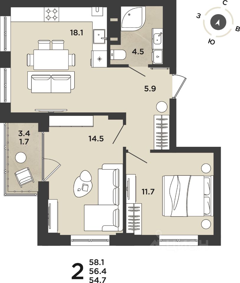 Общая площадь56,4 м²