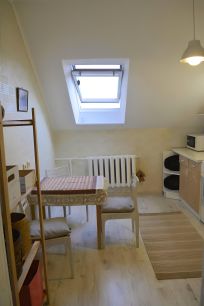 Планировка: Квадратная и очень светлая комната. Большая кухня с мансардным окном что дает дополнительную площадь(по документам ее площадь 7,6 м2, но по факту на 170 см больше), небольшая прихожая , переходящая в просторный холл, раздельный санузел.