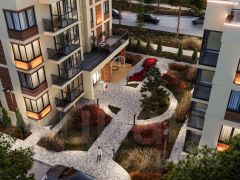 Внутреннее пространство комплекса облагорожено зелеными насаждениями из ценных пород деревьев, высажены кедры, пихты, ели, туи и другие растения, что обеспечивает чувство безопасности и нахождения в гармонии с природным ландшафтом.