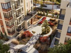 Внутреннее пространство комплекса облагорожено зелеными насаждениями из ценных пород деревьев, высажены кедры, пихты, ели, туи и другие растения, что обеспечивает чувство безопасности и нахождения в гармонии с природным ландшафтом.