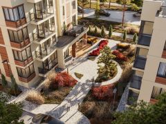 Внутреннее пространство комплекса облагорожено зелеными насаждениями из ценных пород деревьев, высажены кедры, пихты, ели, туи и другие растения, что обеспечивает чувство безопасности и нахождения в гармонии с природным ландшафтом.