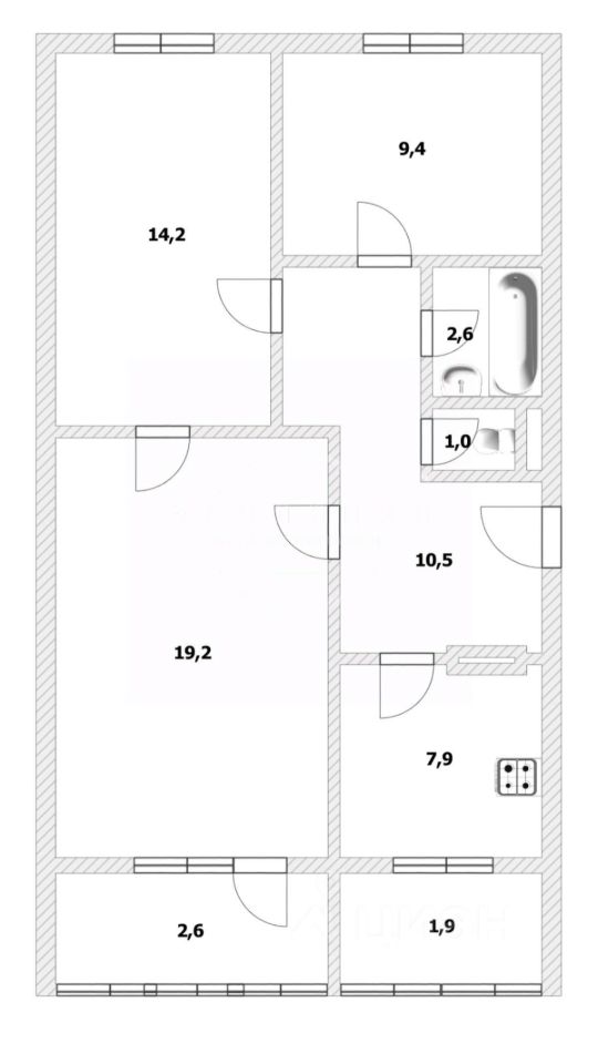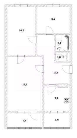 Площадь: общая 64.8м2., жилая 42.8м2, кухня 7.9м2.