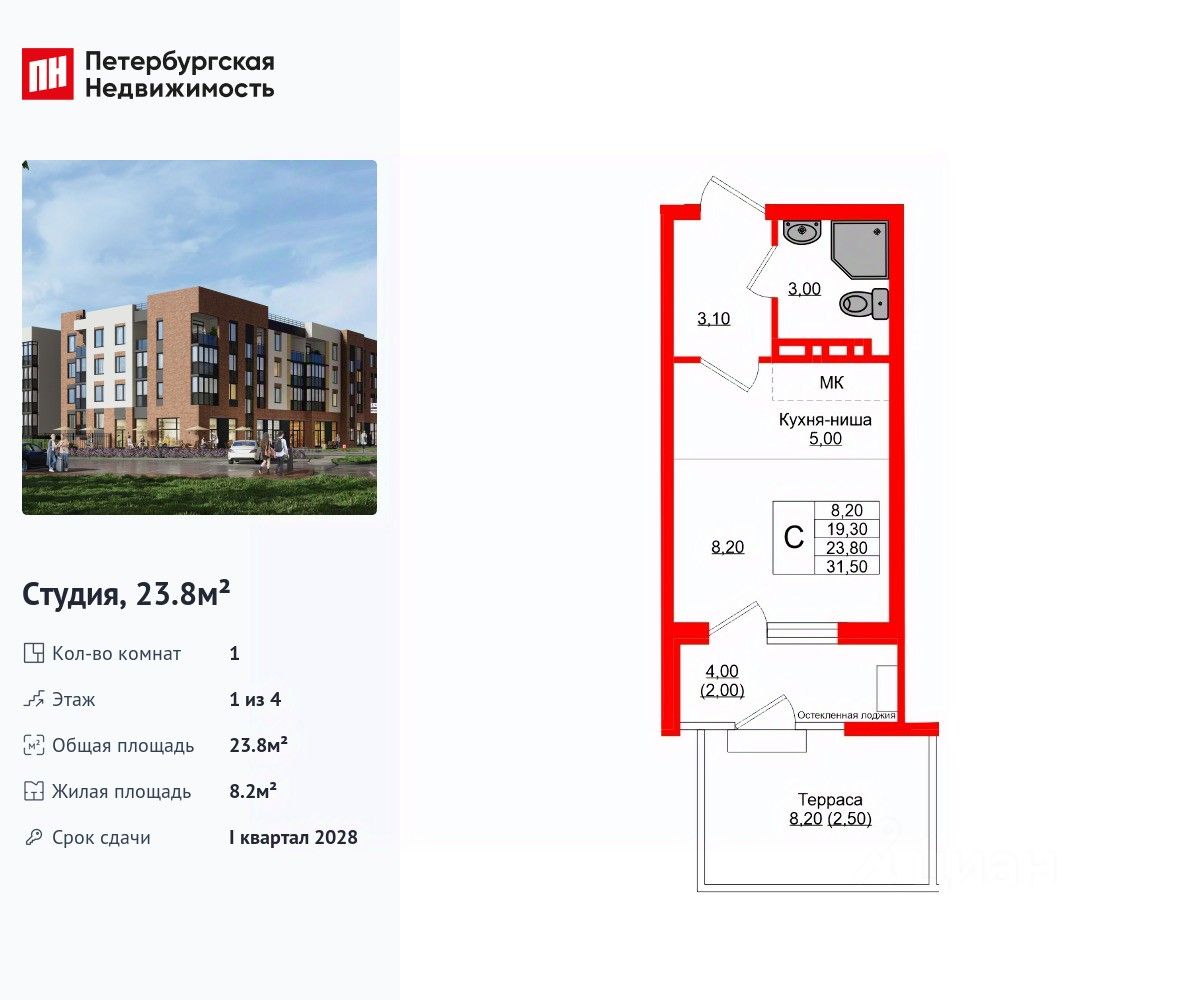 Удобная, классическая, функциональная европланировка, большая кухня-гостиная 5 м², вместительная прихожая 3.1 м². Общая площадь студии - 23.8 м², жилая 8.2 м², высота потолка 2.7 м.