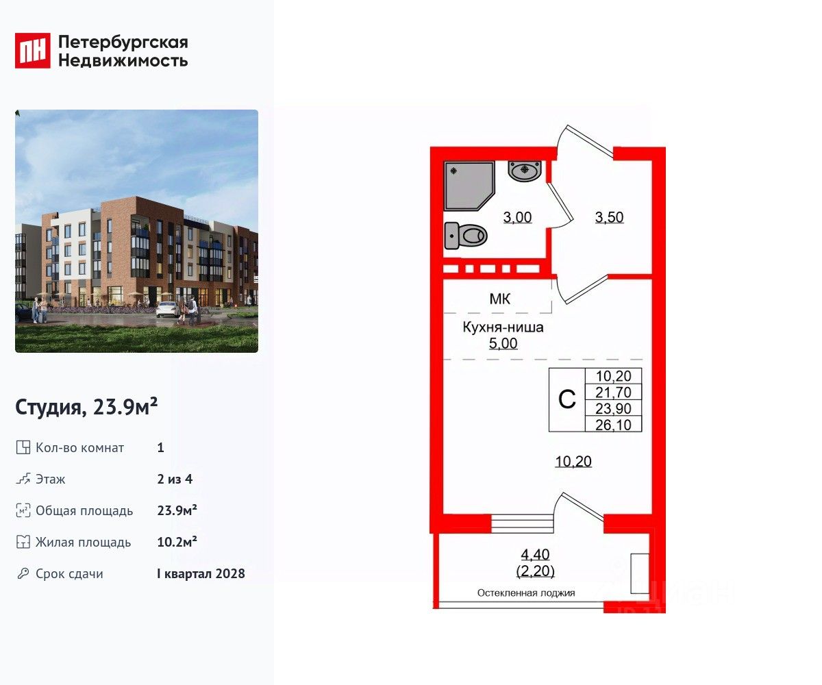 Удобная, классическая, функциональная европланировка, большая кухня-гостиная 5 м², просторная прихожая 3.5 м². Общая площадь студии - 23.9 м², жилая 10.2 м², высота потолка 2.7 м.