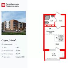 Удобная, классическая, функциональная европланировка, большая кухня-гостиная 5 м², просторная прихожая 3.5 м². Общая площадь студии - 24.4 м², жилая 10.2 м², высота потолка 3 м.