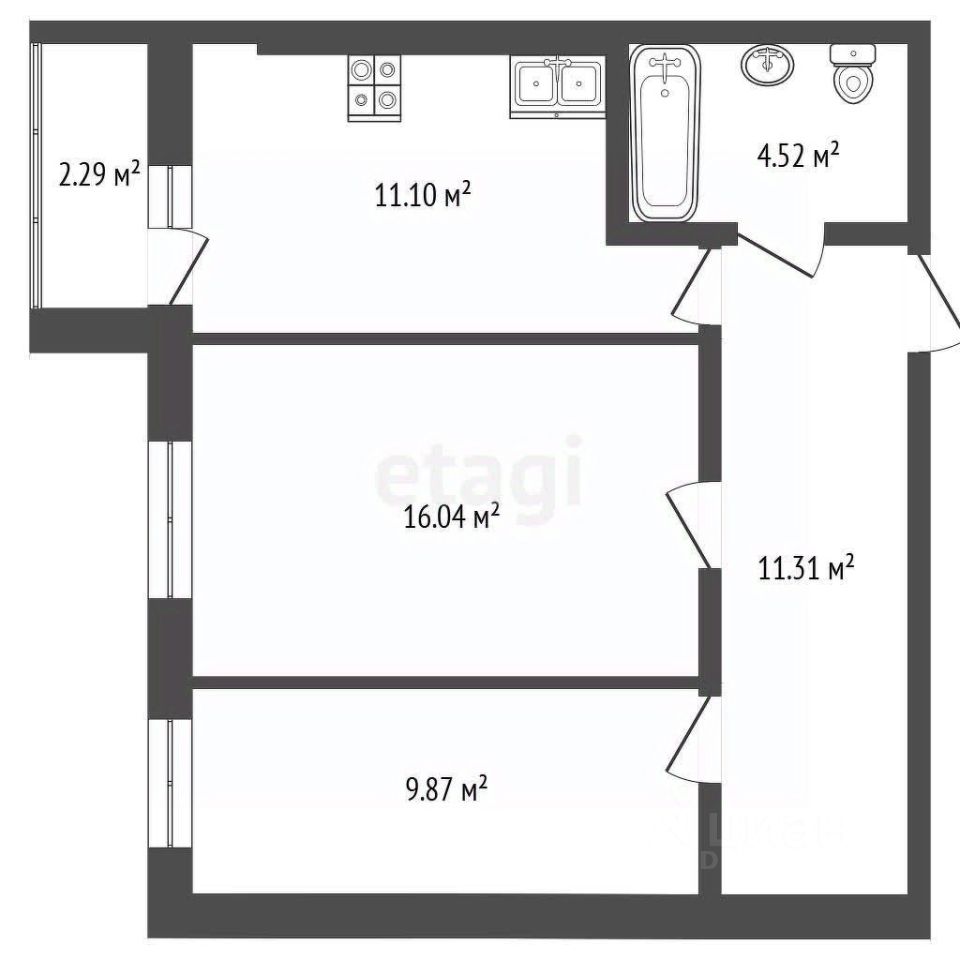 Кухня 11,10 кв. м с выходом на балкон 2,29 кв.м. Один совмещенный санузел.