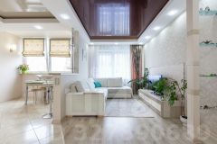 • Дизайнерские потолки: Уникальные потолки с подсветкой в несколько уровней разделяют пространство на зоны, добавляя элегантности и стиля.