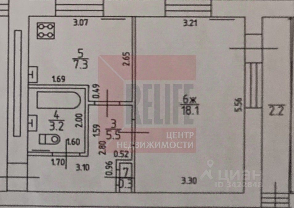 • Общая площадь: 34.4 м²