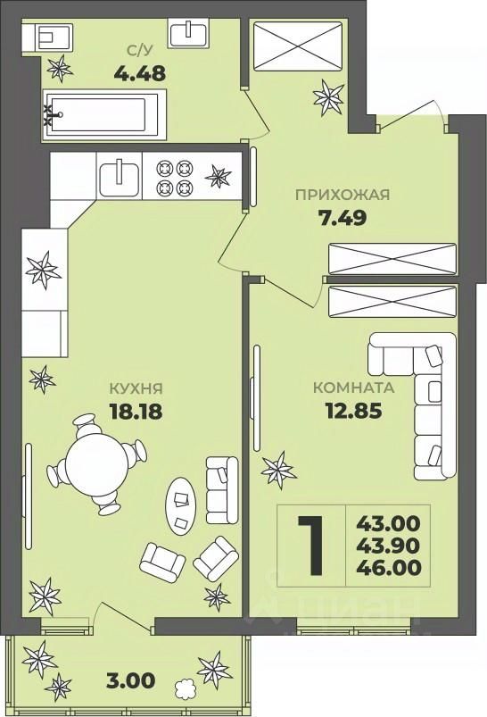 Продаётся 1-комнатная квартира в строящемся доме (Дом 2), срок сдачи: II-кв. 2027, общей площадью 43.9 кв.м., на 6 этаже. ЖК "ГРИНВУД".