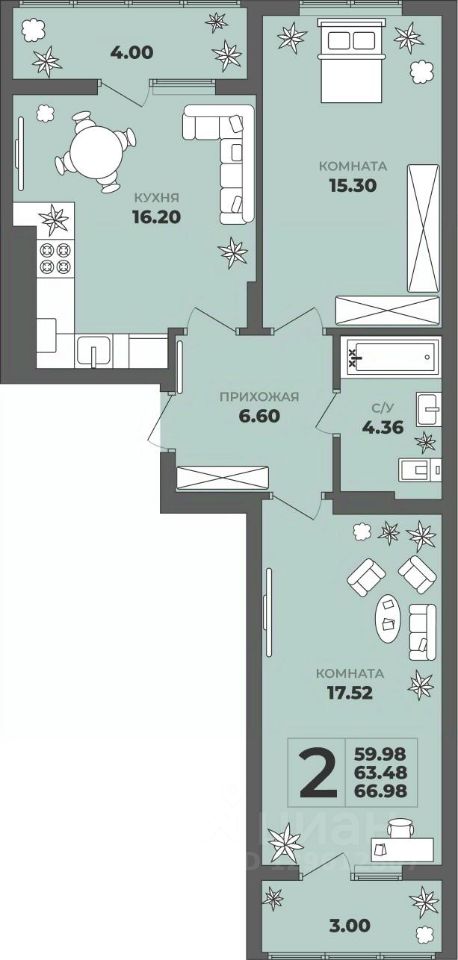 Продаётся 2-комнатная квартира в строящемся доме (Дом 1), срок сдачи: II-кв. 2027, общей площадью 63.48 кв.м., на 4 этаже. ЖК "ГРИНВУД".