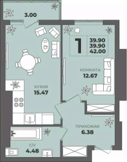 Продаётся 1-комнатная квартира в строящемся доме (Дом 2), срок сдачи: II-кв. 2027, общей площадью 39.9 кв.м., на 4 этаже. ЖК "ГРИНВУД".
