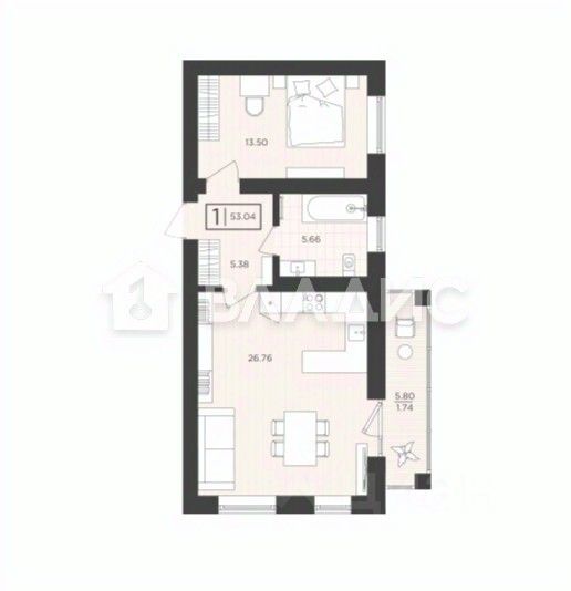 Общая площадь квартиры с учетом балкона - 53,3 кв.м