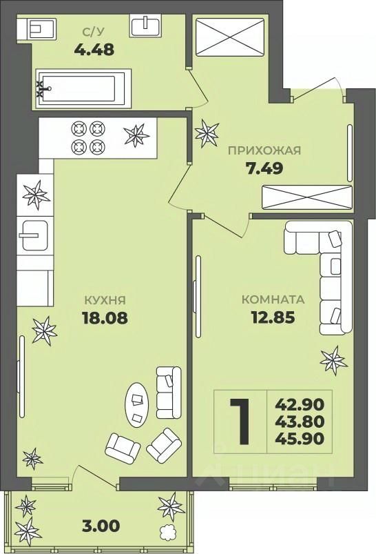 Продаётся 1-комнатная квартира в строящемся доме (Дом 2), срок сдачи: II-кв. 2027, общей площадью 43.8 кв.м., на 8 этаже. ЖК "ГРИНВУД".