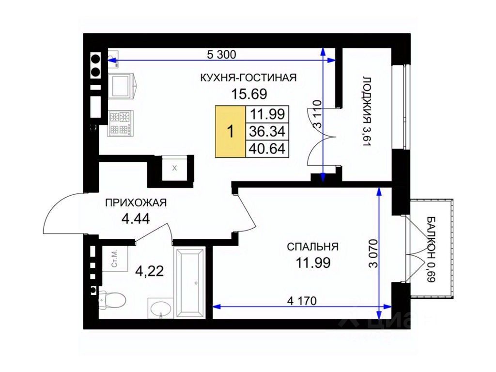 Общая площадь41,1 м²