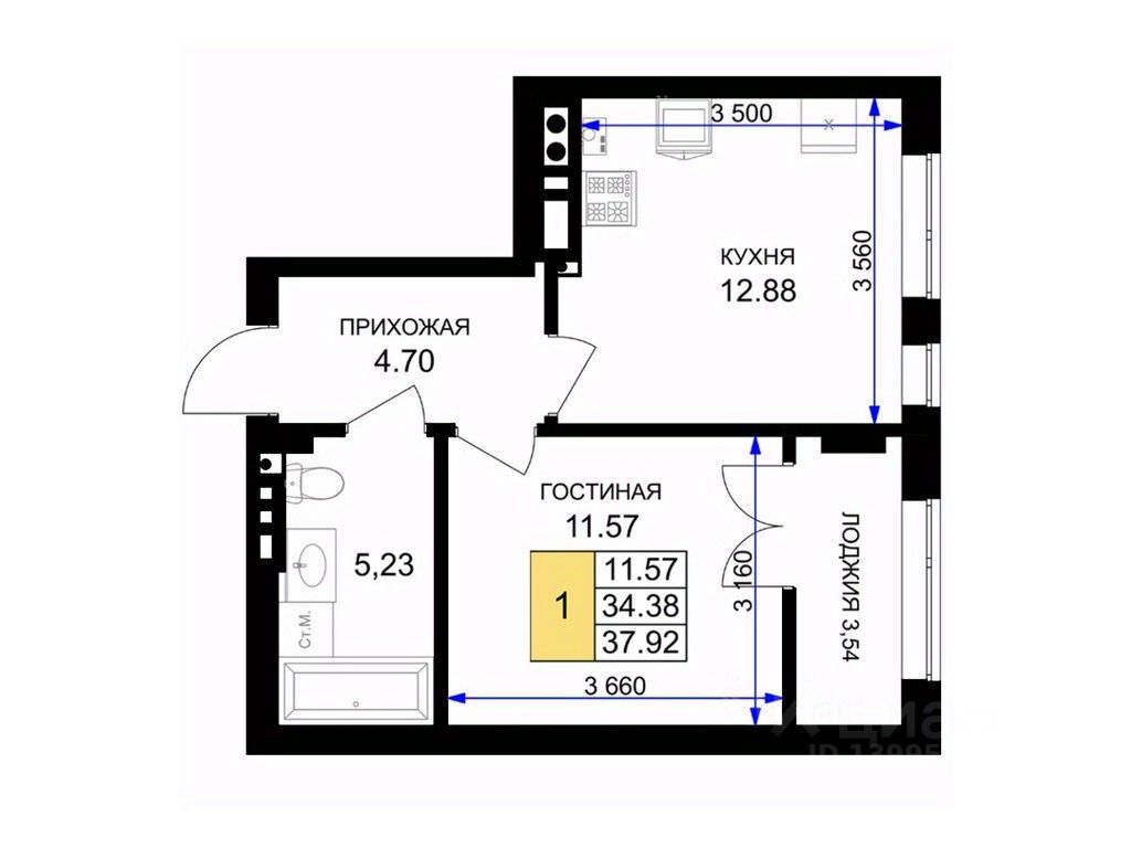 Общая площадь38,4 м²