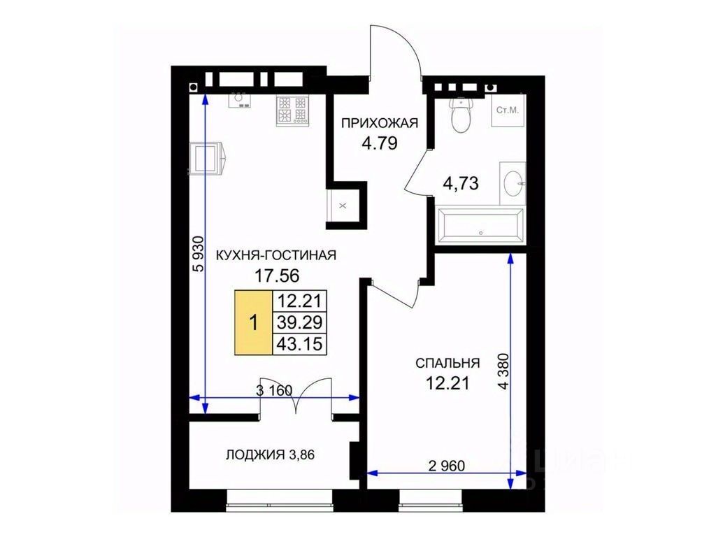 Общая площадь43,9 м²