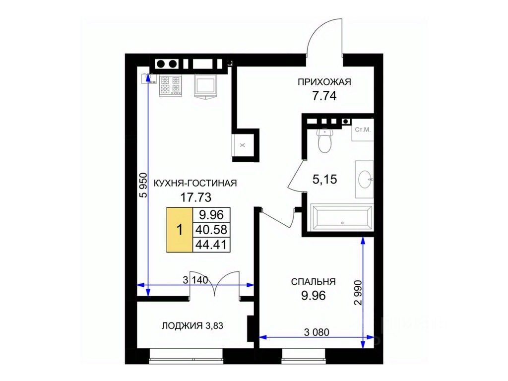 Общая площадь44,9 м²