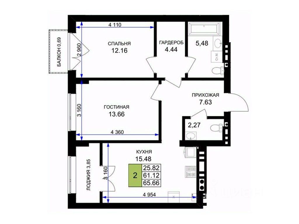 1 лоджия, 1 балкон
