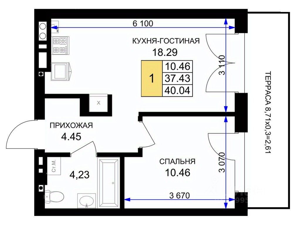 Общая площадь40,6 м²