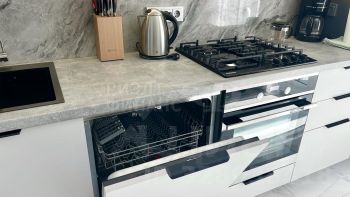 Кухня оснащена встроенной бытовой техникой: холодильник, микроволновая печь, посудомоечная машинка шириной 60 см., духовой шкаф и газовая плита.