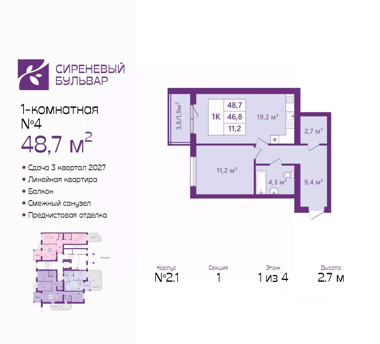Просторная однокомнатная квартира с предчистовой отделкой в ЖК "Сиреневый бульвар" на 1 этаже. Общая площадь: 48.7 кв.м., жилая: 11.2 кв.м., площадь просторной кухни-столовой: 19.2 кв.м. Все окна выходят на одну сторону. В квартире один балкон, один совмещенный санузел. Высота потолков 2.7 м.