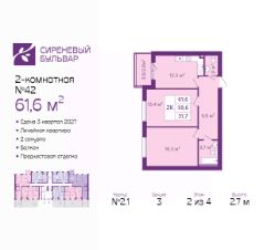 Продается двухкомнатная квартира от застройщика с предчистовой отделкой в ЖК "Сиреневый бульвар" на 2 этаже. Общая площадь: 61.6 кв.м., жилая: 31.7 кв.м., площадь просторной кухни-столовой: 12.3 кв.м. Комнаты изолированные, все окна выходят на одну сторону. В квартире один балкон, один совмещенный и один раздельный санузел. Высота потолков 2.7 м.