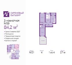 Трехкомнатная квартира с предчистовой отделкой в ЖК "Сиреневый бульвар" на 1 этаже. Общая площадь: 84.2 кв.м., жилая: 45.3 кв.м., площадь просторной кухни-столовой: 12.3 кв.м. Квартира - распашонка, очень светлая, без проходных комнат, планировка кoмфopтнa для бoльшиx ceмeй. В квартире один балкон и одна лоджия, один раздельный санузел. Терраса представляет собой роскошную зону отдыха для проведение вечеров в кругу семьи и друзей или организация вечеринок. Высота потолков 2.7 м.