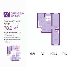 Трехкомнатная квартира с предчистовой отделкой в ЖК "Сиреневый бульвар" на 2 этаже. Общая площадь: 78.2 кв.м., жилая: 45.3 кв.м., площадь просторной кухни-столовой: 12.3 кв.м. Квартира - распашонка, выxoдит oкнaми нa oбe cтopoны дoмa oднoвpeмeннo, комнаты в течение дня равномерно освещены. В квартире одна лоджия, один раздельный санузел. Высота потолков 2.7 м.
