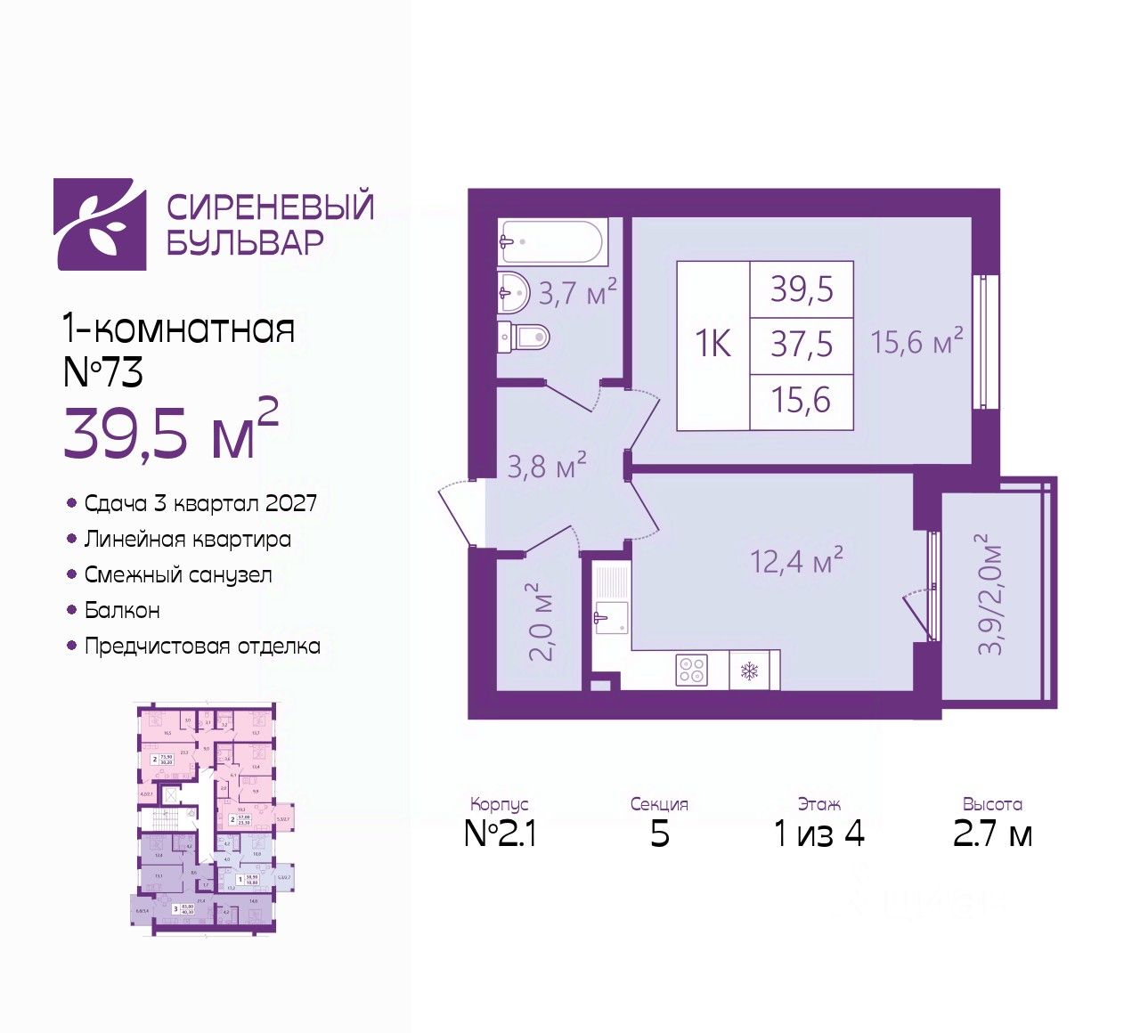 Однокомнатная квартира от застройщика с предчистовой отделкой в ЖК "Сиреневый бульвар" на 1 этаже. Общая площадь: 39.5 кв.м., жилая: 15.6 кв.м., площадь просторной кухни-столовой: 12.4 кв.м. Все окна выходят на одну сторону. В квартире один балкон, один совмещенный санузел. Высота потолков 2.7 м.
